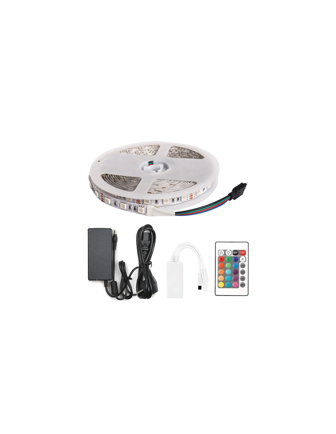 - Ruban 5m fourni avec télécommande, alimentation, transformateur.
